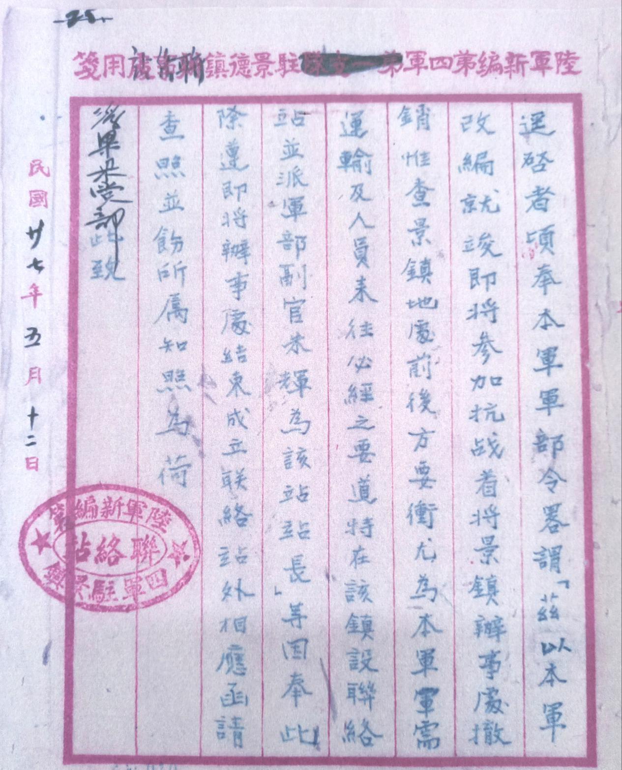 上图内容为“遥启者顷奉本军军部令,畧谓【兹以本军改编就竣。即将参加抗战,着将景德镇办事处撤销,惟查景镇地处前后方要卫,尤为本军军需运输及人员来往必经之要道,特将该镇设联络站并军部副官朱辉为站长。】等因奉此除遵即将办事处结束成立联络站外,相应函请查照并饬所属知照为荷。此致浮梁县党部!”