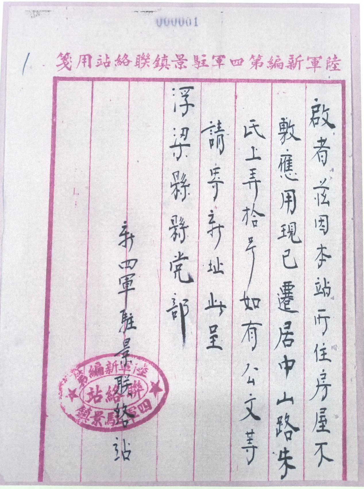 上图内容为“启者,兹因本站所住房屋不敷应用,现已迁居中山路朱氏上弄拾号。如有公文等请寄新址,此呈浮梁县县党部。新四军驻景联络站”