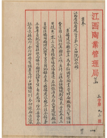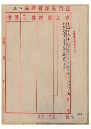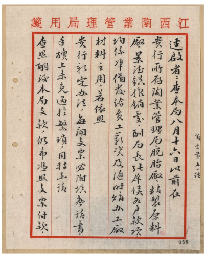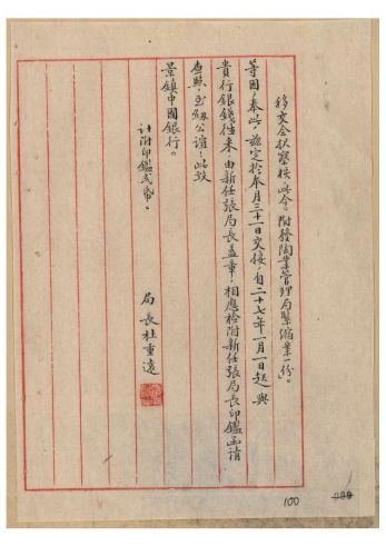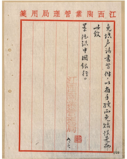 1937年底杜重远卸任江西陶业管理局局长,由副局长张浩接任,就此情况致函景德镇中国银行。自1938年1月开始,所有与贵行银钱来往,由新任张局长盖章。这是江西陶业管理局新旧交替的一份见证。