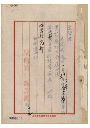 ▲抗日救亡歌咏团关于告知召开歌咏大会并请派员指导的函(市档案馆馆藏)