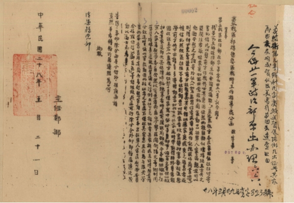 主要内容为查近来后方各民众团体付寄书札信片以慰前方作战将士其用意虽佳,但前方之将士最为关注还是家中近况。故要求各党政机关和民众团体应发动出征抗敌军人家属亲友致信前方,即可解前方将士思乡之情,又可勉力其奋勇杀敌(如不能写信者或剪物或作记号或作剪画亦可)。有按二十一军政治部原函办理的批示。