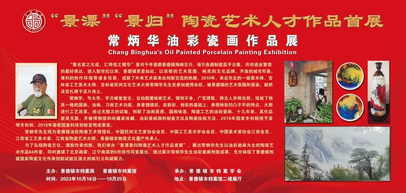 为喜迎2023中国景德镇国际陶瓷博览会,助力景德镇国家陶瓷文化传承创新试验区建设,全面展示“景漂”“景归”人才的作品魅力和精神风貌,“景漂”“景归”陶瓷艺术人才作品展首展——“常炳华油彩瓷画作品展”在景德镇市档案馆展出,欢迎社会各界前来参观。