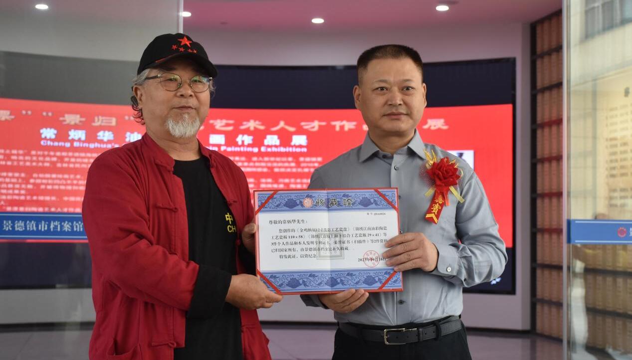 景德镇市档案馆馆长林茂盛为常炳华颁发捐赠作品收藏证书;中共景德镇市委办公室副主任余红有,景德镇陶瓷大学原党委副书记、校长宁钢分别致辞。