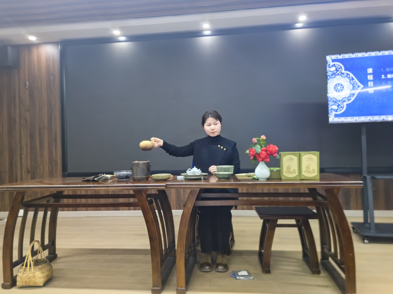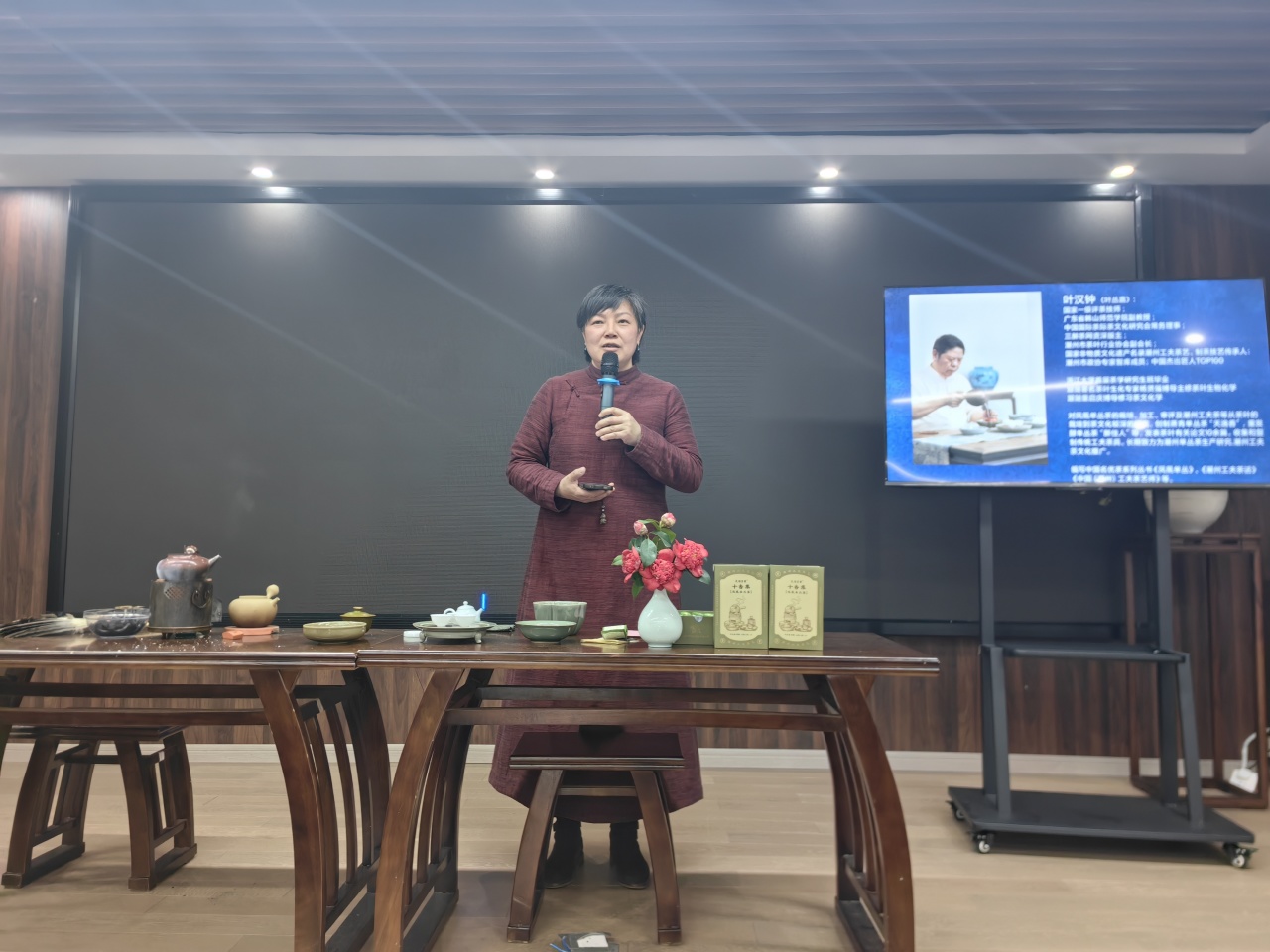 活动现场,专业茶艺师余秋云老师身着传统服饰,优雅登场。她首先详细介绍了潮州工夫茶这一国家级非物质文化遗产的悠久历史,从其起源的明清时期讲起,讲述了工夫茶如何在潮汕地区逐渐发展、传承,并成为当地独特文化符号的历程。同时,还展示了精美的工夫茶茶具,逐一讲解了它们的用途与特色。