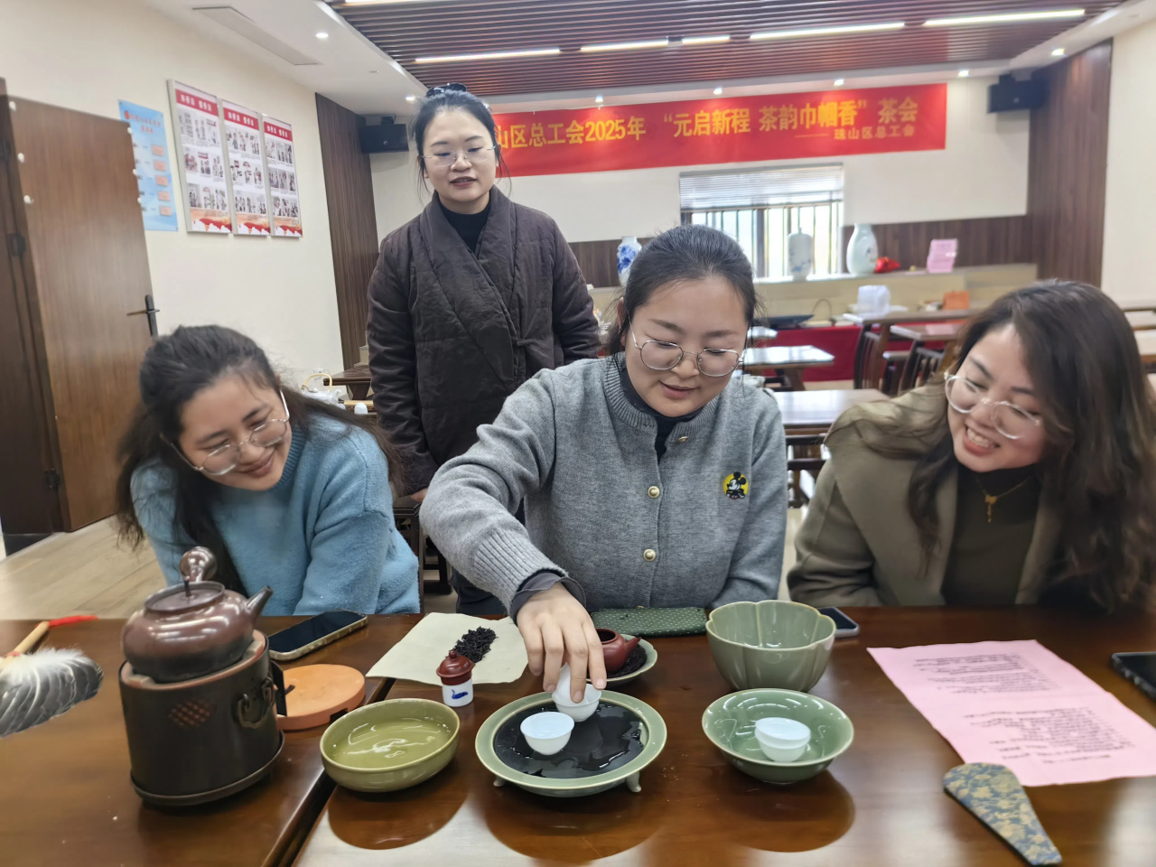在茶艺演示环节,茶艺师手法娴熟,动作如行云流水,将潮州工夫茶的二十一程式冲泡步骤演绎得淋漓尽致。从温壶烫盏到关公巡城、韩信点兵,每一个步骤都精准到位,令人目不暇接。现场茶香四溢,女职工们全神贯注地观看,不时为精彩的演示发出阵阵赞叹。