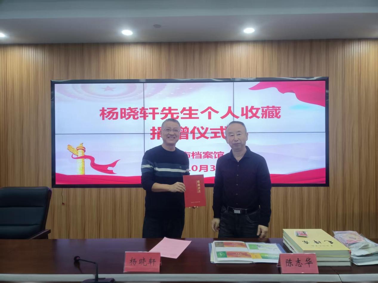 近日,市档案馆举行个人收藏档案捐赠仪式,热心市民杨晓轩先生将其珍藏的一批具有重要历史与文化价值的档案资料无偿捐赠给市档案馆。馆党组成员、副馆长、三级调研员陈志华出席仪式。