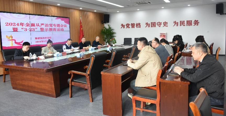 为深入学习贯彻习近平总书记关于党的自我革命的重要思想,进一步落实全面从严治党主体责任,不断将市档案馆全面从严治党和党风廉政建设向纵深推进,3月25日,景德镇市档案馆召开2024年全面从严治党专题会议暨“3·23”警示教育活动。馆党组书记、馆长林茂盛参加会议并讲话,市纪委市监委派驻市教体局纪检监察组副组长王蔚到会指导。馆党组成员、副馆长陈园媛主持会议,全馆干部职工参加会议。