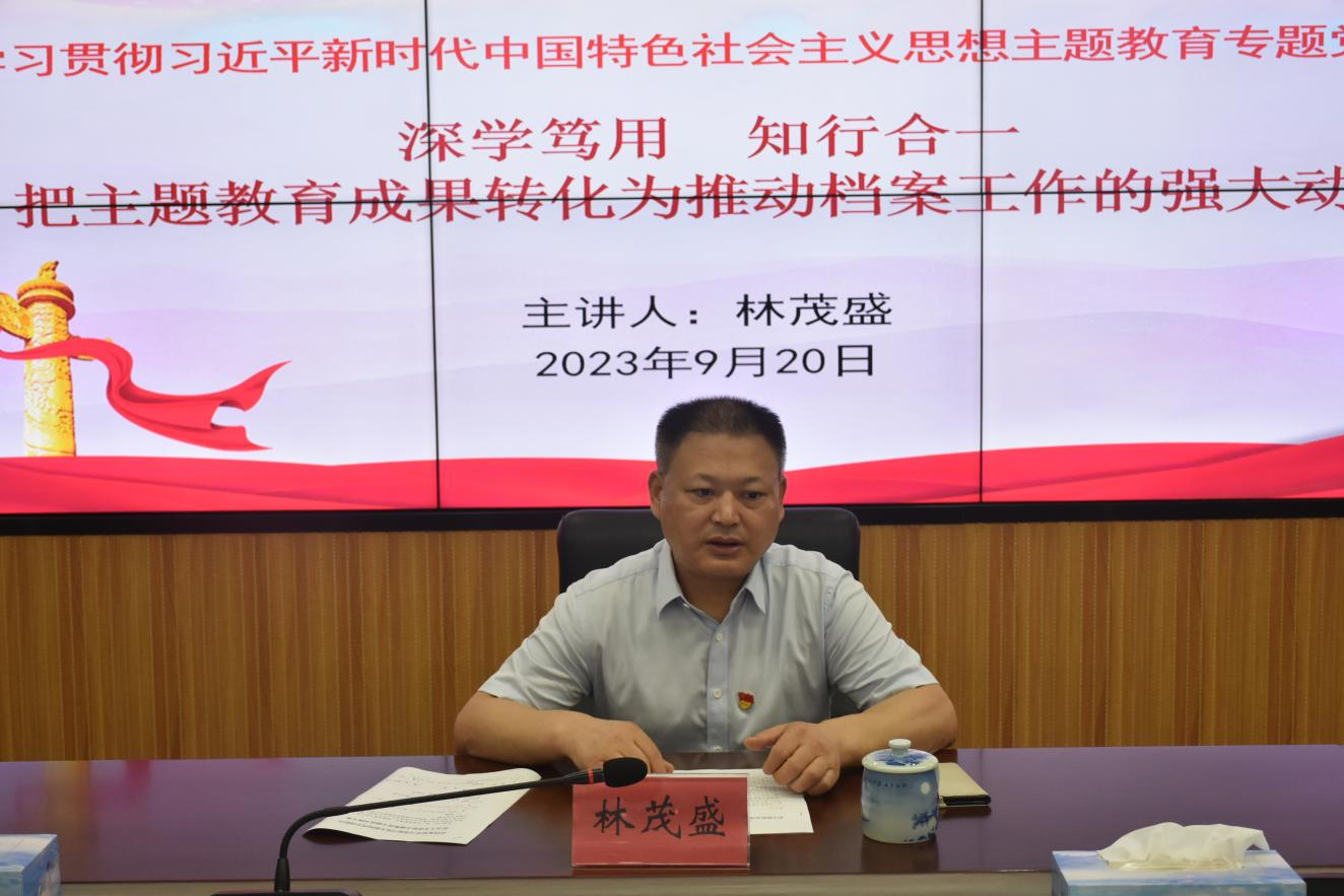 林茂盛强调,全体党员干部要以学正风,进一步加深对党的作风建设重要性、遵规守纪自觉性、发挥表率作用的认识,更加自觉坚定地把作风建设摆在突出位置,以刀刃向内的自我革命精神革除作风积弊,实现自我净化、自我完善、自我革新、自我提高;要以学促干,立足岗位实际,掌握科学工作方法,着力解决实际问题,切实把学习创新理论的成效转化为推动档案工作的强大力量和服务中心大局、为民办好实事的实绩实效。