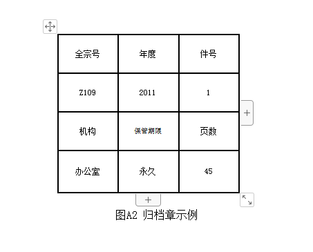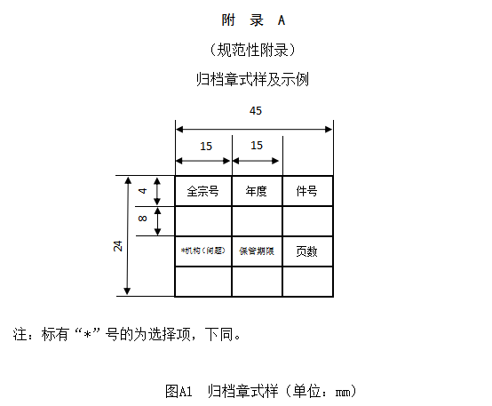 2.4.5归档章应将档号的组成部分,即全宗号、年度、保管期限、件号,以及页数作为必备项,机构(问题)可以作为选择项,见附录A 图A1。归档章中全宗号、年度、保管期限、机构(问题)按照5.4.3 编制,件号、页数用阿拉伯数字标识。为便于识记,归档章保管期限宜使用“永久”“30 年”“10 年”简称标识,机构(问题)宜使用“办公室”等机构(问题)名称或规范化简称标识,见附录A 图A2。