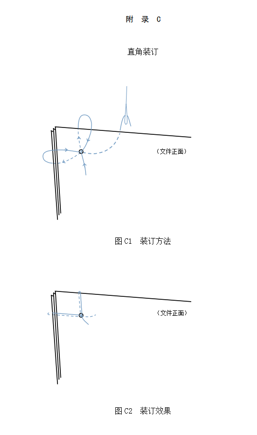3.2.4永久保管的归档文件,宜采取线装法装订。页数较少的,采取直角装订,见附录C 图C1、图C2,文件较厚的,采取“三孔一线”装订。永久保管的归档文件,采取不锈钢订书钉或浆糊装订的,装订材料应满足归档文件长期保存的需要。