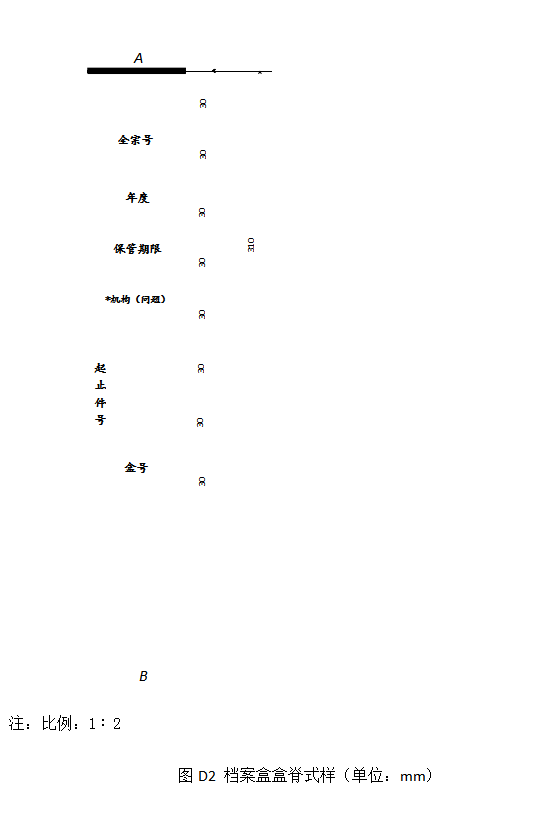 3.4.3档案盒封面应标明全宗名称。盒脊设置全宗号、年度、保管期限、起止件号、盒号等必备项,并可设置机构(问题)等选择项,见附录D 图D2。其中,起止件号填写盒内第一件文件和最后一件文件的件号,起件号填写在上格,止件号填写在下格;盒号即档案盒的排列顺序号,在档案移交进馆时按档案馆进馆要求编制。
