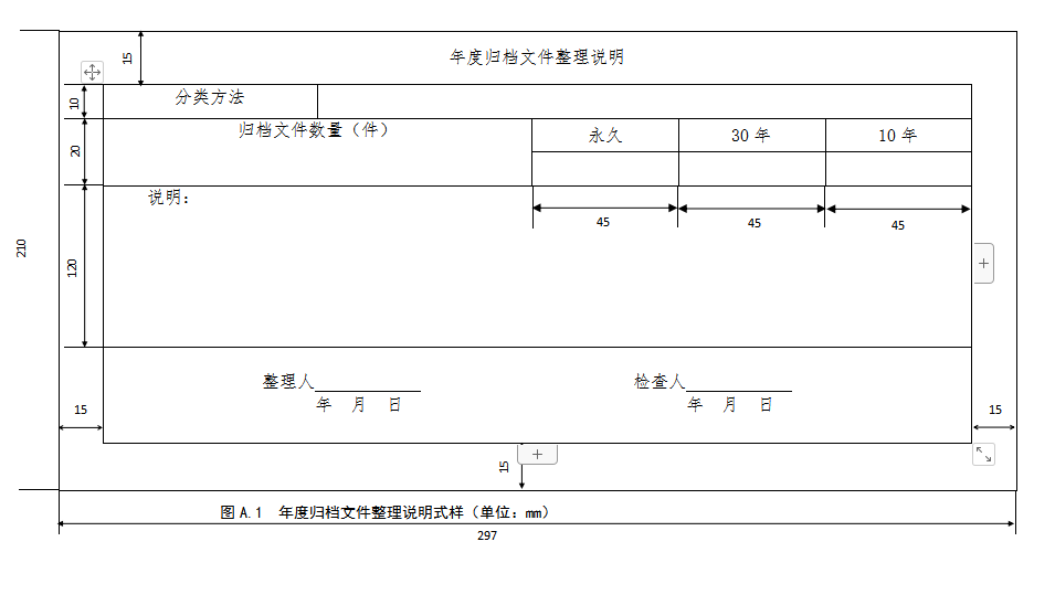 归档文件整理完毕,应按年度填写“年度归档文件整理说明”,见附录E 图E1。主要说明分类方案、年度归档文件的总数量、不同保管期限归档文件的数量,该年度归档文件缺损、修改、补充、移出、销毁等情况,并填写归档文件的整理人、检查人和日期。“年度归档文件整理说明”一式两份,填写完毕后分别放入归档文件目录后和全宗卷中。